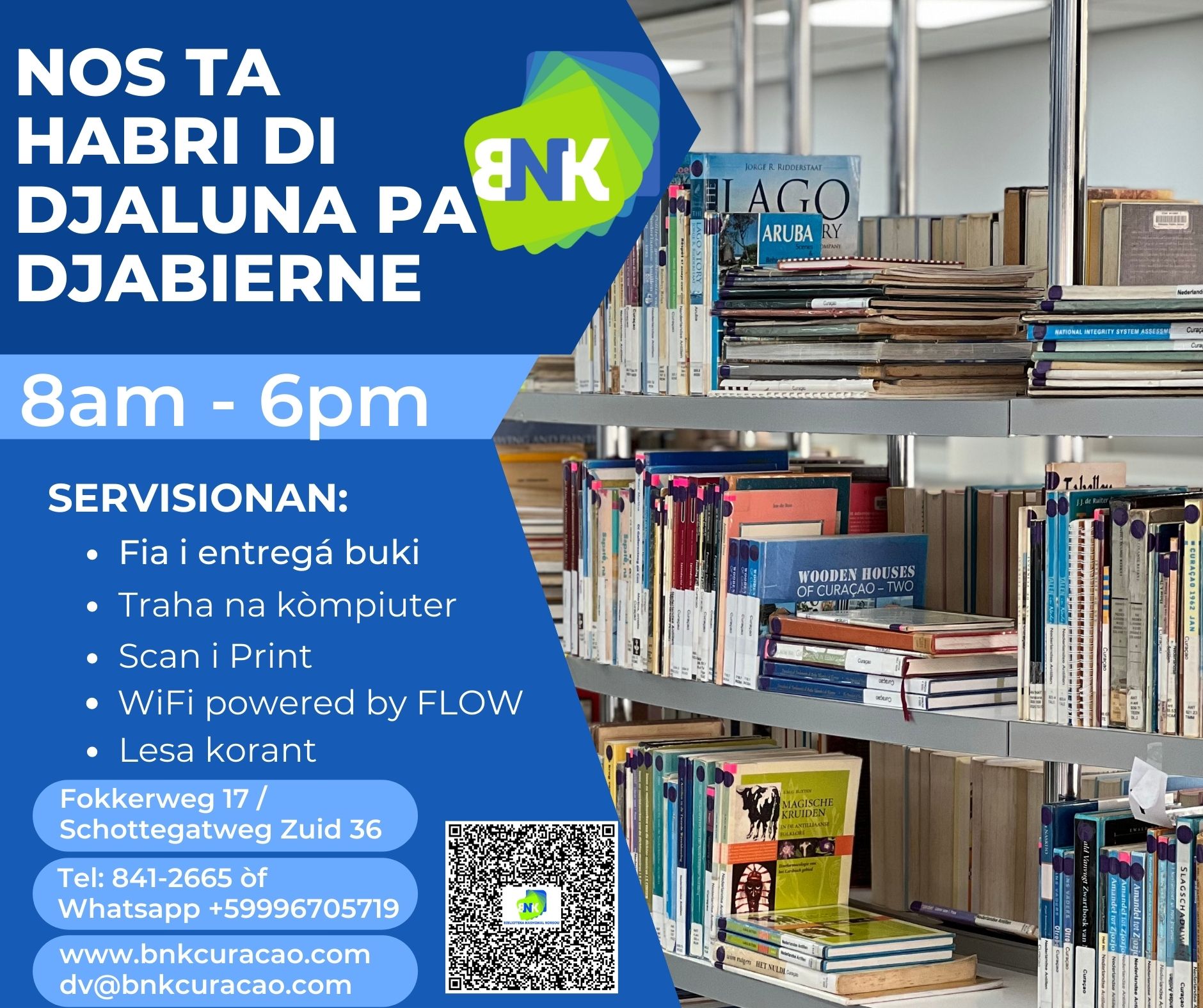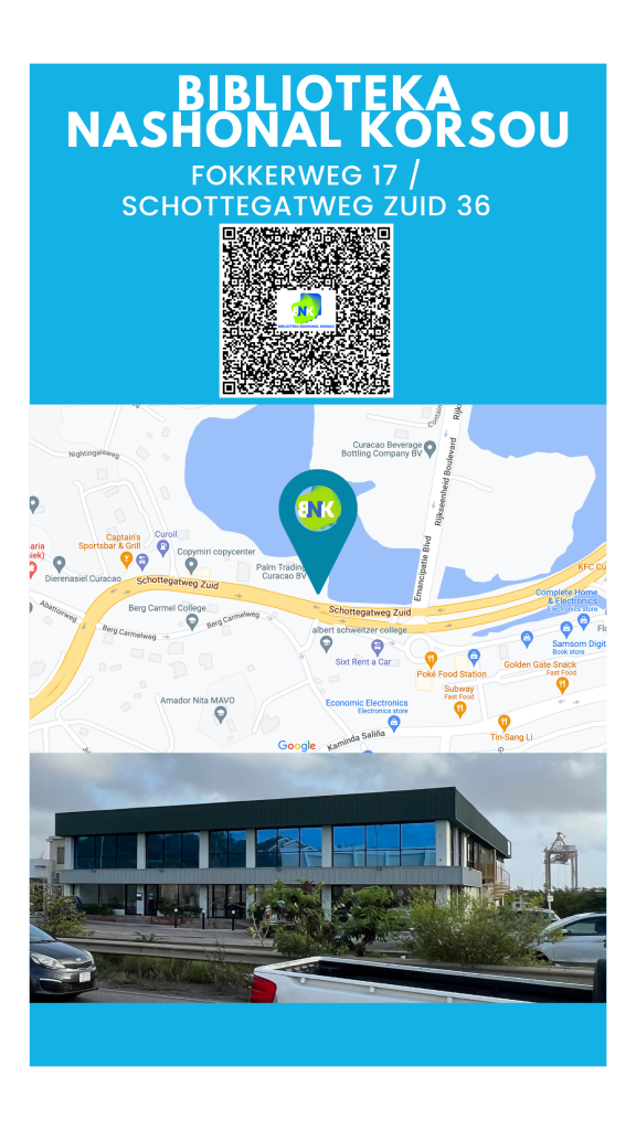 Preserving the past and welcoming the future. Become a member and get your library card Apply New e-booksOnline BibliotheekRequest an extension Latest news Celebrating World Book and Copyright DayApril 19, 2024 New company sign for the libraryApril 18, 2024 Art by Isabel BerenosApril 17, 2024 Upcoming events Thinking where to host your next event?Reserve flexible space Take a look at these Our staff picks Berg AltenaBerg Altena Kiesstelsels en hun ConsequentiesMr. O.A. Castillo Anansi Tumba-festivalOlga Orman en Johan Volkerijk The little book of the Holy GrailSangeed Duchane Island VibesHelmi Smeulders Een beloofd LandBarack Obama Kòrsou, un pasado riku : Curaçao, een rijk verledenE promesa na Tula Laura Quast E kañonnan di Kintjan Hubert V. Penza Ten'i nan ten Merly Augusta / Ariadne Faries Brùg a kai! Ilse Schoobaar- Anthony Kalbas ta bal muchu mas Edelmira Koko E kayuka grandi Jeroen Hoogerwerf Willemstad na kandela Loekie Morales Chikitu, kòrá i milagroso Diana Lebacs Tulito i su amigunan pèrdí Ingomar Martie Asina Nia a siña tokante Outonomia den Reino Crisèn Schorea Lus ta sende Myrurgia Mutueel Historia di Don Karibe Donald Bakhuis Di kon kas na Kòrsou tin diferente koló Diana Lebacs Kaida di brùg grandi Loekie Morales Buchi Antwè Indjan Mayó Mercée Doran Partnergeweld in het Caribisch gebiedSandra Wichard Salba bo mes bidaErwin J. Coster "Tumba di Karnaval" de CurazaoEric M. La Croes